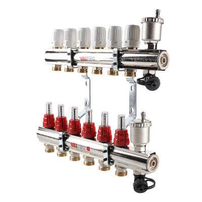 (VTc.596.EMNX) Коллекторный блок со встроенными расходомерами выпускается для распределения теплоносителя к потребителям в системах водяного отопления – радиаторам, конвекторам, петлям теплого пола, обогрева открытых площадок. Рабочая температура теплоносителя – до 90 °С, давление – до 10 бар.