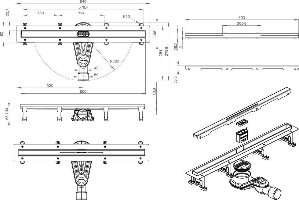 W01SC-S11-060-05BM MasterFlow Трап для душа линейный универс затвор Slim line 60см цвет черн мат