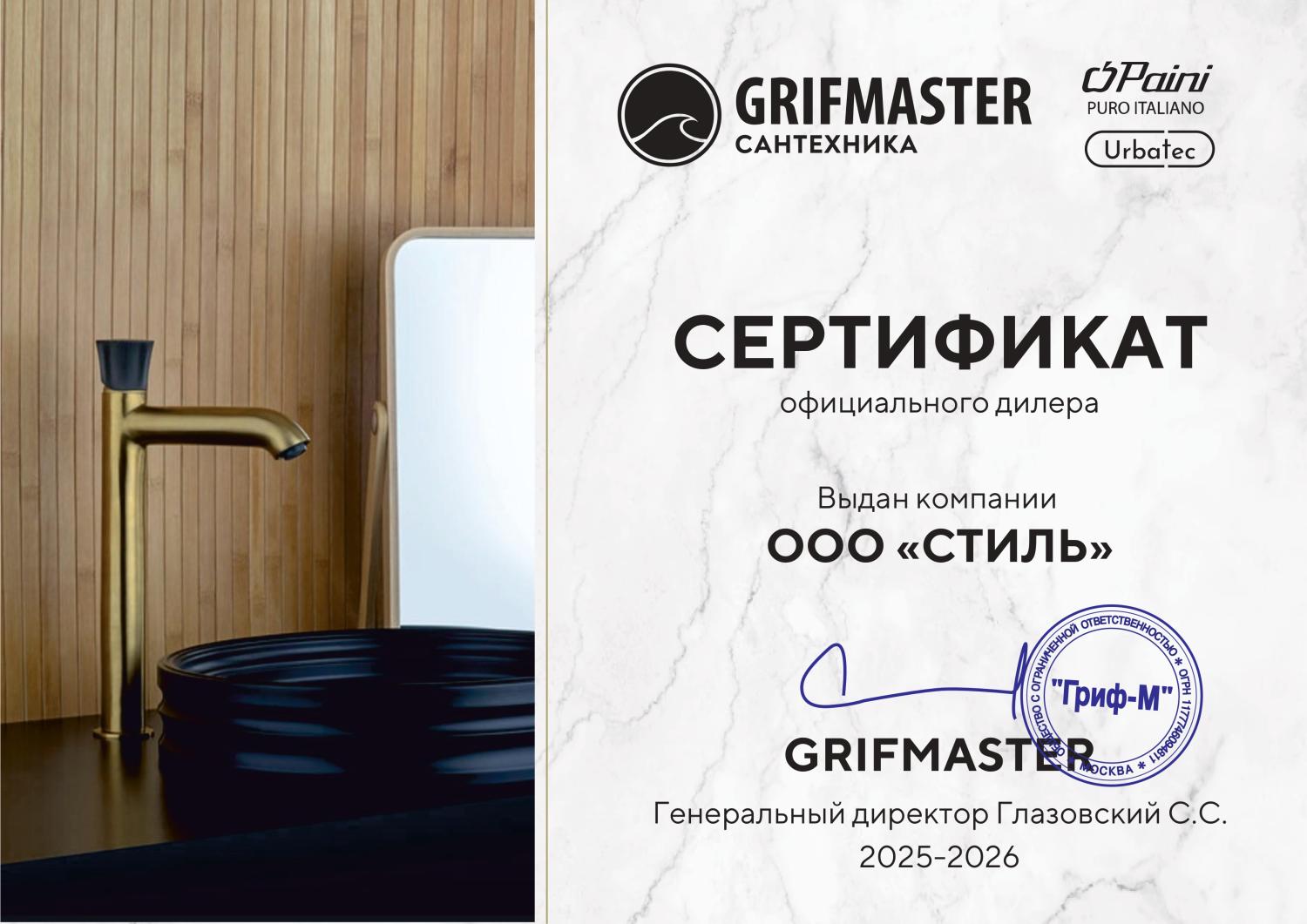 Сертификат официального дистрибьютора от бренда Paini